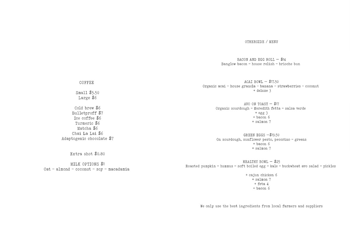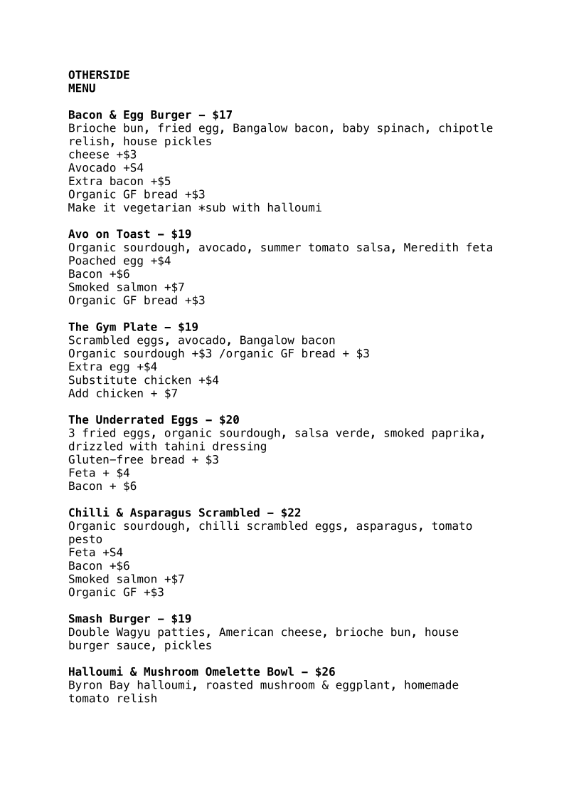 Welcome to OTHERSIDE cafe, a delightful culinary haven nestled in the heart of Byron Bay. Known for its impeccable quality and inviting atmosphere, this café quickly earned rave reviews from patrons who adore its thoughtfully crafted menu. Each dish reflects a commitment to care and quality, with signature offerings like the aromatic avocado toast elevated by feta, pesto, and fresh basil, earning accolades from many visitors.